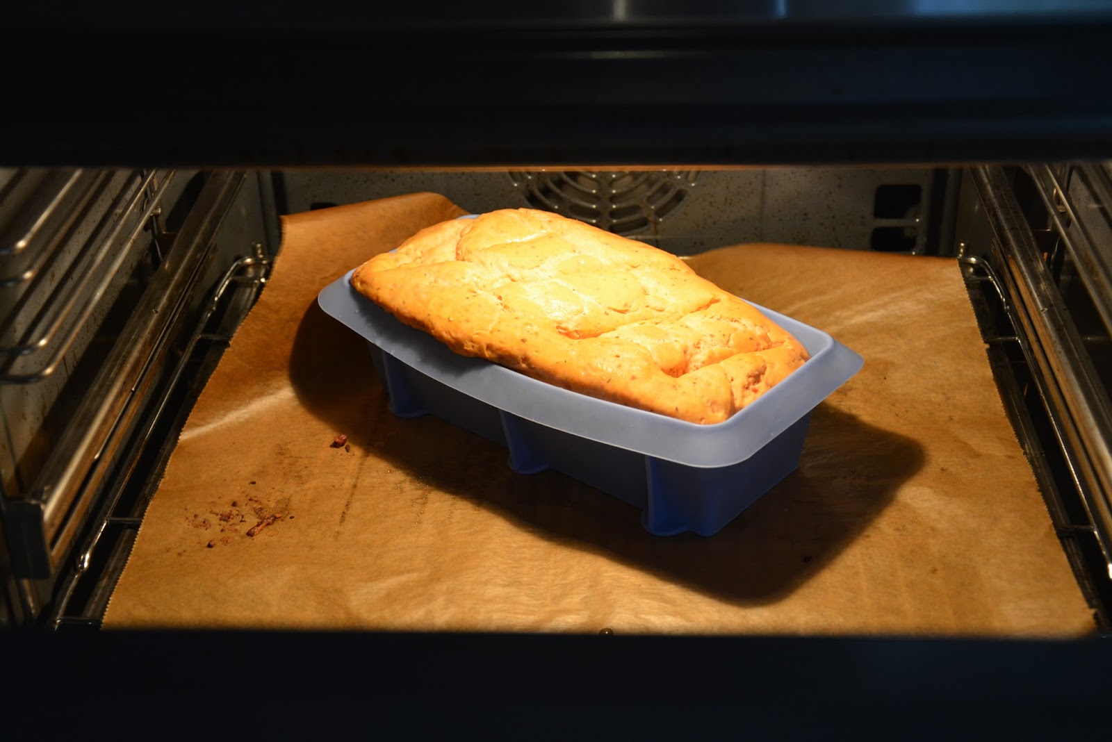 2. Teig kurz zu einem länglichen Laib formen, in eine gut mit Olivenöl gefettete Kastenform (35cm) geben und 30 Minuten an einem warmen Ort gehen lassen.